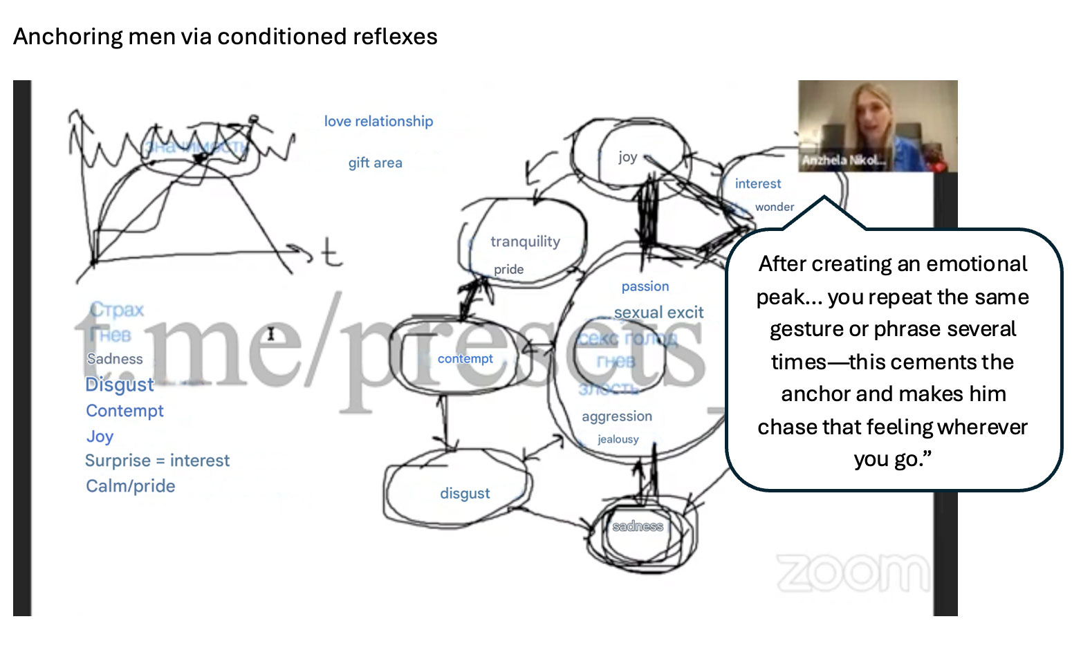 In reality, they advocate leveraging relationships in games of emotional manipulation for material gain. Their materials teach clients to destabilize partners through techniques including push-pull mood swings, cryptic messaging and sensory anchors designed to condition reflexive attachment—tactics aimed at extracting money, attention, and control.