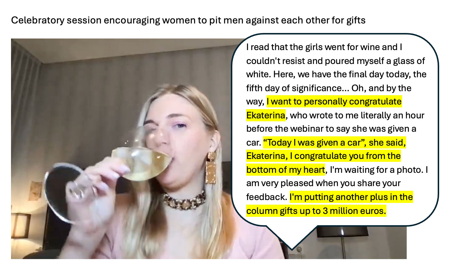 They self-describe as 'authors of programs that help women increase their importance and increase financial flow' with claims of over 25,000 'students'.